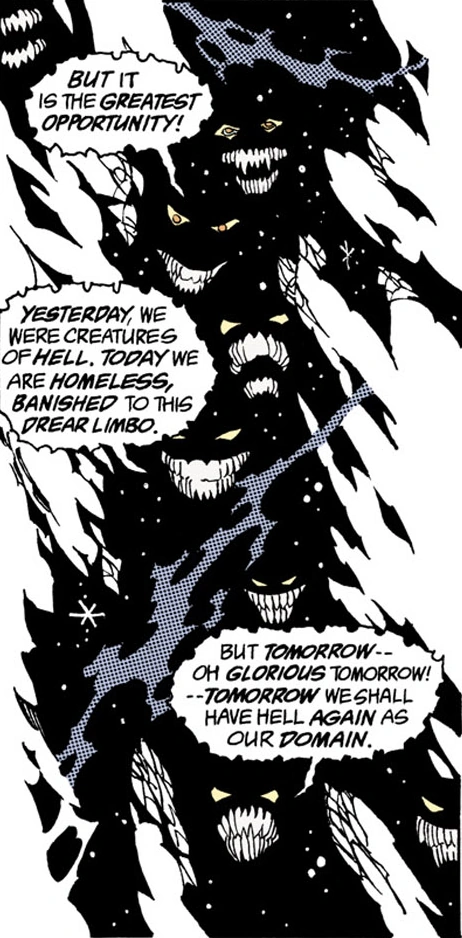 It returned in Season of Mists. After Lucifer evacuated and closed Hell, he left the key to the gates to Dream. Azazel was one of the petitioners for the key, and the right to rule Hell, with the Merkin and Choronzon. "I seek the return of our lands, the lands of my people, the lands from which we have been unjustly expelled. I do not come as a mere ambassador, but as the representative of all daemonkind...." Azazel offered "a sweetener" to its demand, it offered to return to Dream his former lover Nada in exchange for the key.