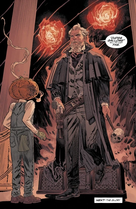 Yet, like a nightmare, Quentin Gallows never completely disappears. Since he is only an idea—the fear of the cruel and implacable judge—he resurfaces years later, in The Dreaming Vol. 2 (2018). In this story, when the Dreaming realm descends into chaos after Dream's disappearance, Mervyn Pumpkinhead frees him to "restore order." Gallows immediately seizes power, imposes tyrannical laws, manipulates Lucien, and enslaves the Dreaming's inhabitants. His reign becomes a living nightmare, illustrating the dangers of letting an idea born of fear reign unchecked.