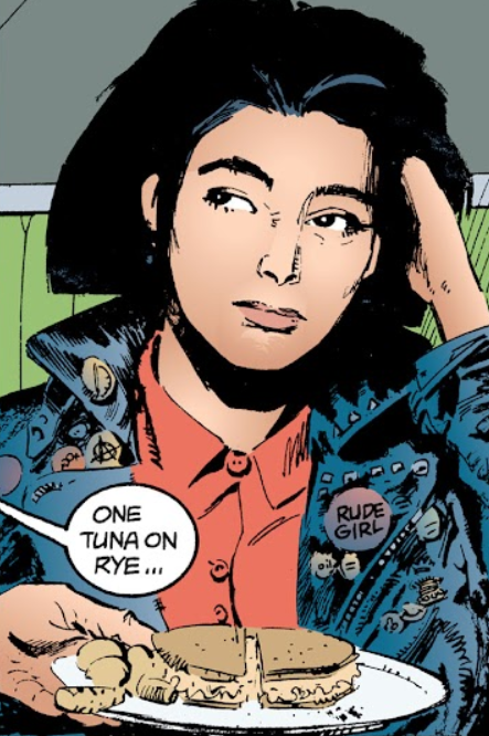Judy was a slim black-haired girl in her late teens or early twenties. She is seen wearing a leather jacket characteristic of counterculture, complete with an assortment of pins and a symbol of lesbian love on her back.