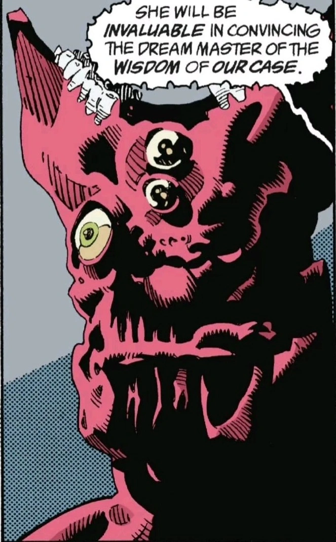 The Merkin first appeared in Season of Mists. She was chosen for the demon contingent, led by Azazel, that traveled to the Dreaming to petition for the Key to Hell, which was then in the possession of Dream.