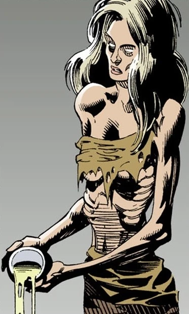 Sigyn is a gaunt woman with pale skin, an extremely bony body and disheveled blonde hair, wearing a torn brown two-piece cloth.
